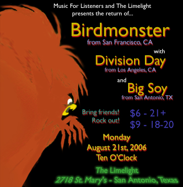 For Listeners and The Limelight present Birdmonster - (San Francisco, CA) with Division Day - (Los Angeles, CA) Big Soy - (San Antonio, TX) Monday August 21, 2006 The Limelight - 2718 N. St Mary's 10 PM $6 - 21+ (flyer by Michael A. Thomas) |