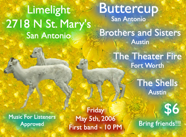 For Listeners and The Limelight present Buttercup - (San Antonio, TX) with Brothers and Sisters - (Austin, TX) The Theater Fire - (Fort Worth, TX) The Shells - (Austin, TX) Friday May 5, 2006 The Limelight - 2718 N. St Mary's 10 PM $6 - 21+ (flyer by Michael A. Thomas) |